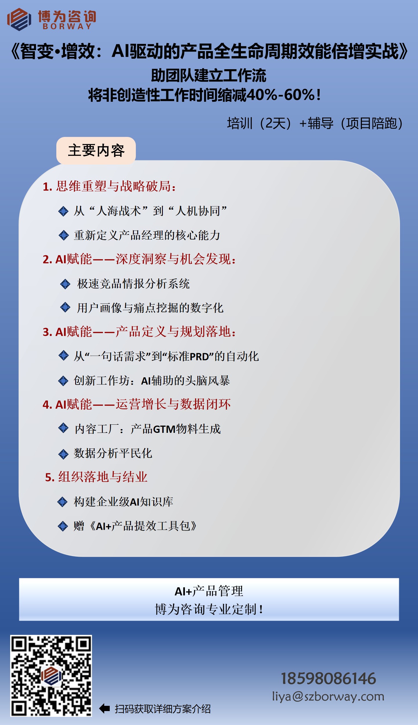 AI重构产品管理,博为咨询深耕AI在产品管理端应用,为产品创新提供指数级的创意方案,快速提升团队的核心战斗力! 《智变·增效:AI驱动的产品全生命周期效能倍增实战》培训项目,敬请关注!