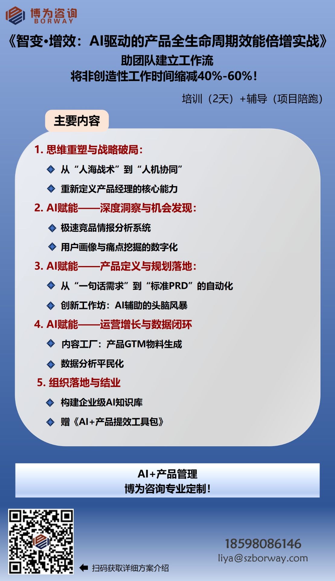 AI重构产品管理,博为咨询深耕AI在产品管理端应用,为产品创新提供指数级的创意方案,快速提升团队的核心战斗力! 《智变·增效:AI驱动的产品全生命周期效能倍增实战》培训项目,敬请关注!