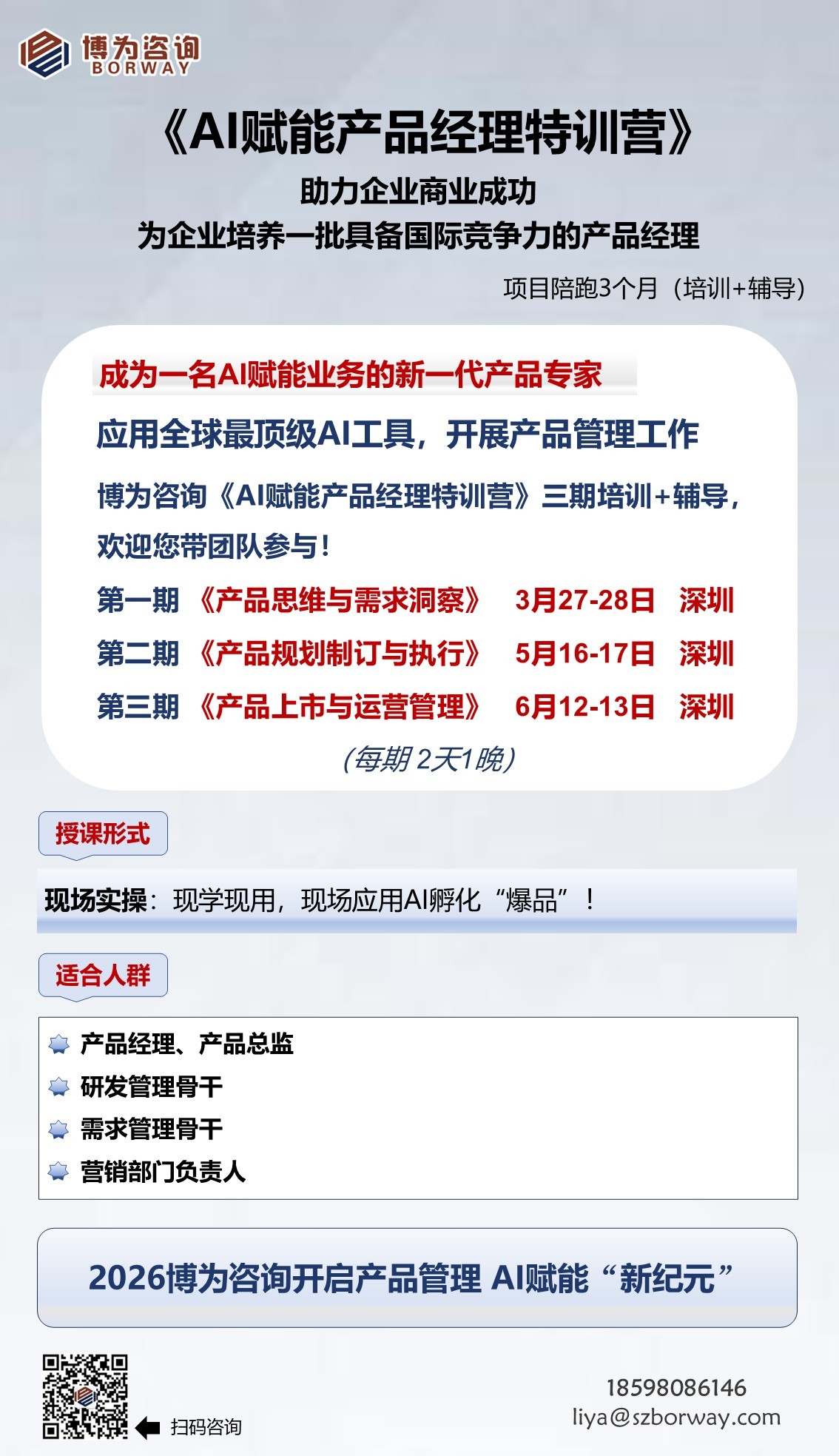 现在,合上焦虑,开启你的90天进化之旅吧。博为咨询《AI赋能产品经理特训营》,助您成为一名AI赋能业务的新一代产品专家,项目陪跑3个月,敬请关注!